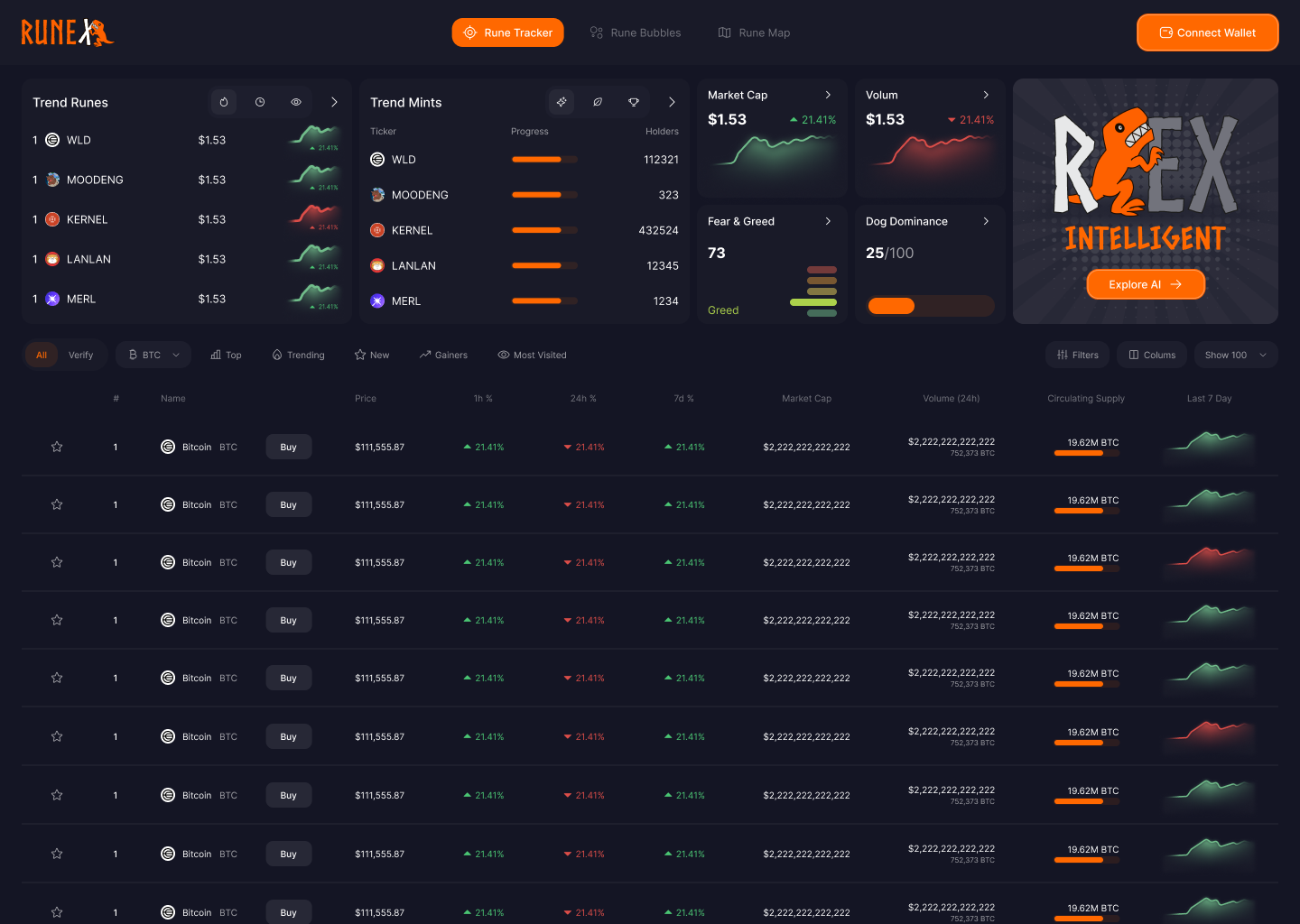 A Bitcoin Runes market tracker used by 100+ daily users. Integrated live data from Magic Eden, UniSat, and OKX to provide real-time rune insights. Implemented batch minting, enabling users to mint up to 24 runes in a single click.