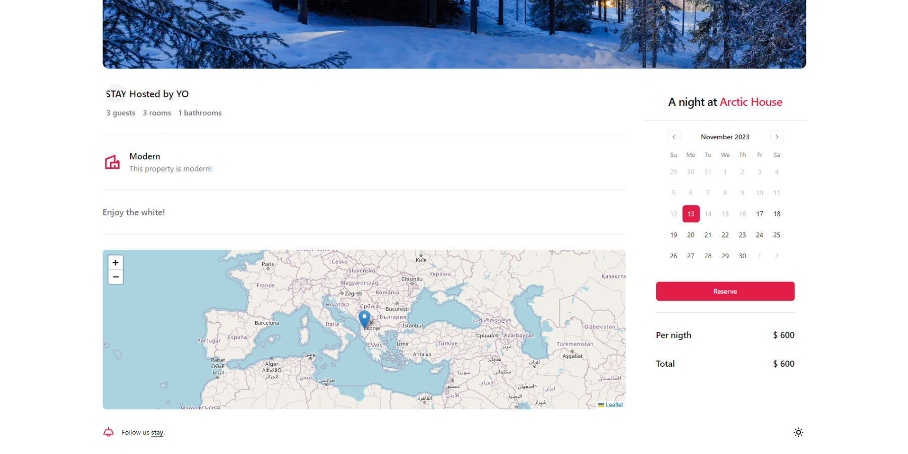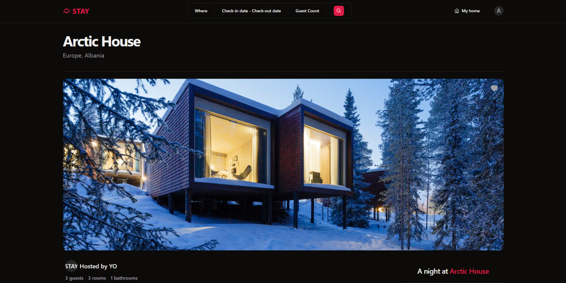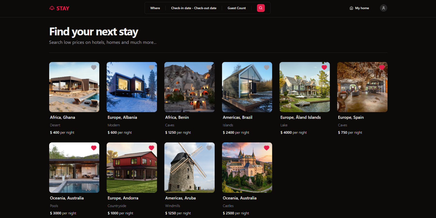 Stay is a practical online accommodation platform that allows users to list their properties, select date ranges for rentals, and seamlessly rent available properties. The platform also offers a feature to add properties to favorites for quick access.